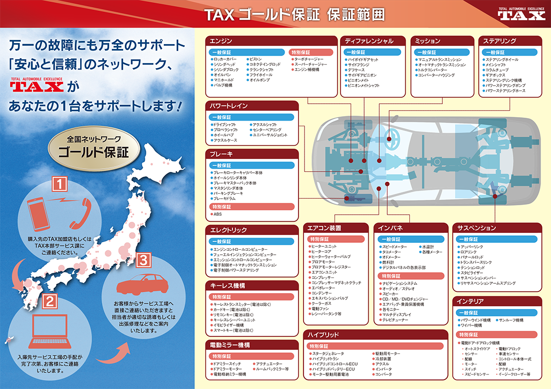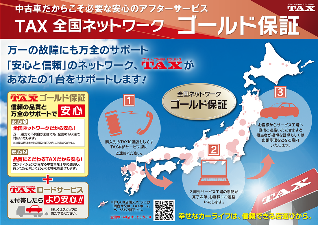 万一の故障にも安心のサポート!「安心と信頼」のネットワーク、TAXがあなたの一台をサポートします。遠方で不具合が起きても、全国のTAX店で対応いたします。